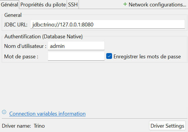 Depuis le client JDBC de votre choix, créez une connexion vers Trino.