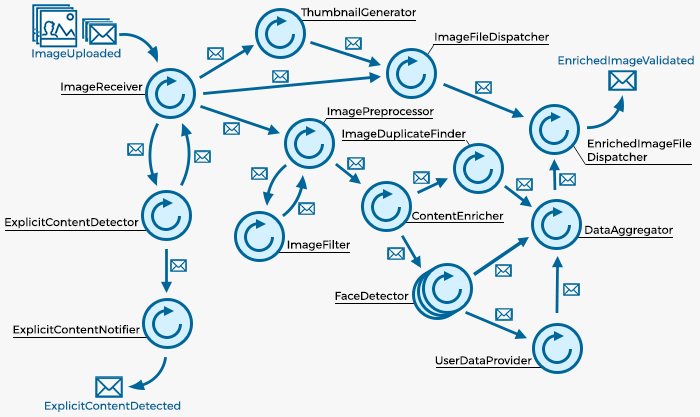 On programme les acteurs de sorte qu’ils organisent le travail à réaliser. On peut les comparer aux robots d’une chaîne de montage: chacun est spécialisé dans une tâche, sait quoi faire d’un élément reçu et sait à qui le transmettre une fois son travail terminé.