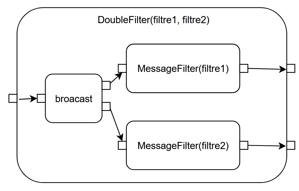La composabilité vient du fait qu’il est possible d’emboîter les composants les uns dans les autres et des chaîner les uns après les autres. Des composants élémentaires peuvent être combinés en des graphes partiels, c’est-à-dire que certaines des entrées ou sorties des composants ne sont connectées à rien. On crée alors un composant de plus haut niveau qui encapsule les composants élémentaires en connectant ses propres entrées et sorties à celles laissées vacantes dans les composants élémentaires. Par exemple, si on se rend compte que la division du flux de messages BlueSky en deux flux filtrés est une pratique récurrente, il peut être intéressant de créer un composant DoubleFilter. On réduit ainsi les assemblages à réaliser.