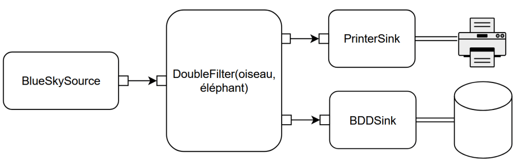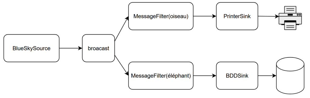 - Les sinks, qui sont des composants consommant un flux d’éléments et ne produisant rien. On peut imaginer un DatabaseSink qui consomme un flux de messages BlueSky et les stocke dans une base de données, ou un PrintSink qui consomme le même flux de messages et les imprime.